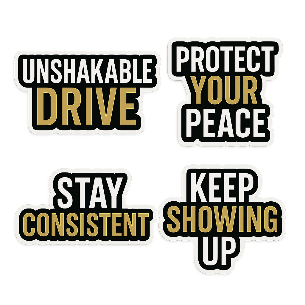 Designed to keep you focused and grounded, this premium 4-piece motivational sticker pack delivers bold reminders in a minimalist, powerful style.